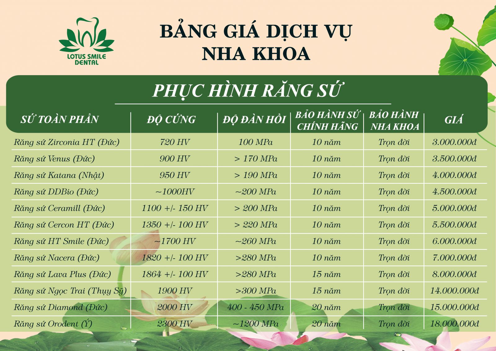 * Lưu ý bảng giá làm răng sứ chưa bao gồm khuyến mại